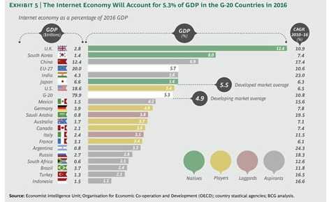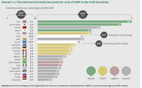 Στις δε ΗΠΑ το Internet αφορούσε το ποσό των $684 δις σε οικονομική δραστηριότητα το 2010 vs. τα $625 για την ομοσπονδιακή κυβέρνηση με την οικονομία των ΗΠΑ να έχει μερίδιο 4.3%. Μεγαλύτερο μερίδιο στη Βρετανία με 8.3% ενώ η Νότιος Κορέα έχει φτάσει το 7.3%.