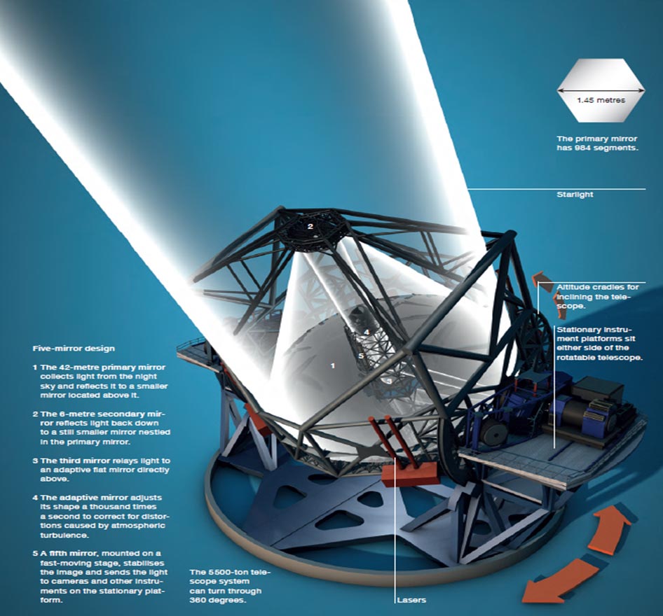 Το επονομαζόμενο European Southern Observatory project θα το ονομάσει ‘European Extremely Large Telescope’, αν και θα κατασκευαστεί τη Νότιο Αμερική και συγκεκριμένα στη Χιλή. Σε ένα μέρος του πλανήτη με τη λιγότερο φωτομόλυνση. Σε λειτουργία το 2022, με την ΕΕ να εξακολουθεί να ονειρεύεται…