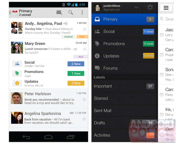 Με slide-out navigation drawer και top-only action bar, αλλά και αναβαθμισμένο updated mobile client που συνδέεται με την εικόνα του profile σε όλα τα sent emails, αλλά και πολλαπλά labels readable.