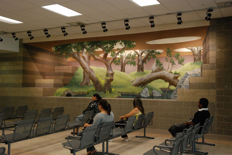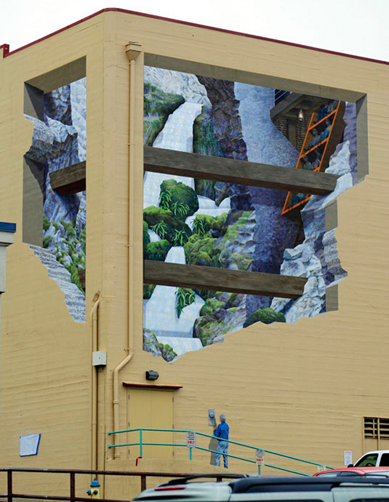 Πρόκειται για τις παγκοσμίου φήμης τοιχογραφίες του καλλιτέχνη John Pugh, που δίνει στα κτίρια την ψευδαίσθηση των τριών διαστάσεων. Ξεκίνησε να κάνει τις πρώτες τοιχογραφίες το 1970 και το ιδιαίτερο στυλ του είναι πλέον αναγνωρίσιμο και γνωστό ως «Narrative illusionism».