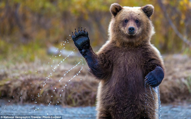 Ένα αρκουδάκι που μοιάζει να χαιρετά ενώ η μητέρα του κυνηγά σολωμούς