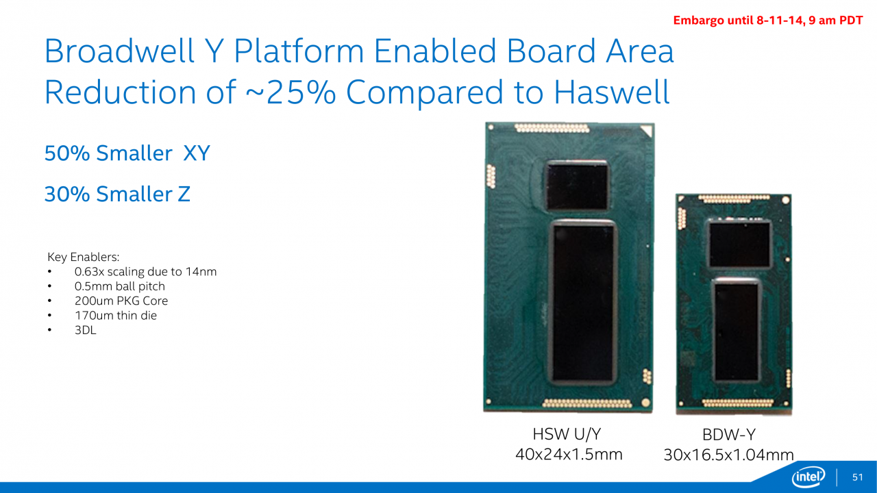 Τα άλλα τρία είναι ίδια σε μνήμη, TDP και Hyper-Threading αλλά: το Core M 5Y51, είναι ένα 1.1 / 2.6 GHz τσιπ με HD 5300 γραφικά σε 300 / 900 MHz, το Core M 5Y31, είναι στα 900 MHz / 2.4 GHz με iGP στα 300 / 850 MHz.