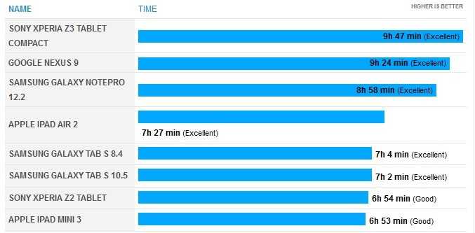 Κορυφαία θέση για το Sony Xperia Z3 Tablet Compact, που δεν είναι ΜΟΝΟ το πιο λεπτό (6.4mm), αλλά έχει και την καλύτερη αυτονομία. Στις δοκιμές το Sony Xperia Z3 Tablet Compact έφτασε τις 9 ώρες και 47 λεπτά με μια φόρτιση!