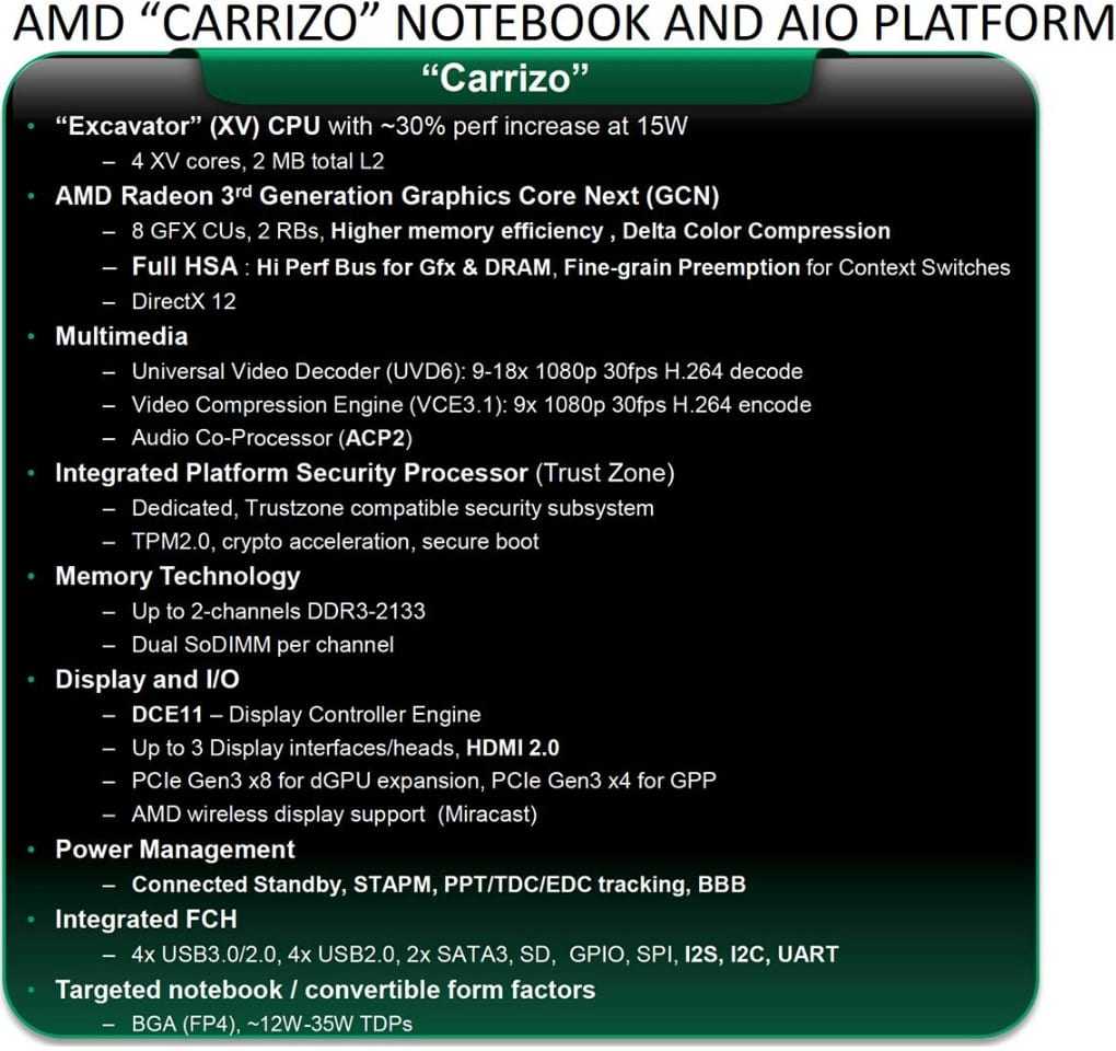 Η AMD έχει ανακοινώσει δύο εκδόσεις από το Νοέμβρη, Carrizo και Carrizo-L. Carrizo και θα βγουν κάπου στο Q2 2015 στην Computex με κατασκευή στα 28nm.